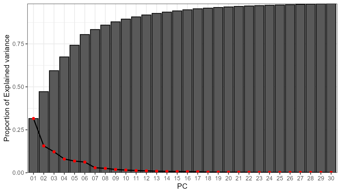 info <- pca_decision(vars_torrential,ncomp = 30,norm = T,matrix_mode = "T-mode")