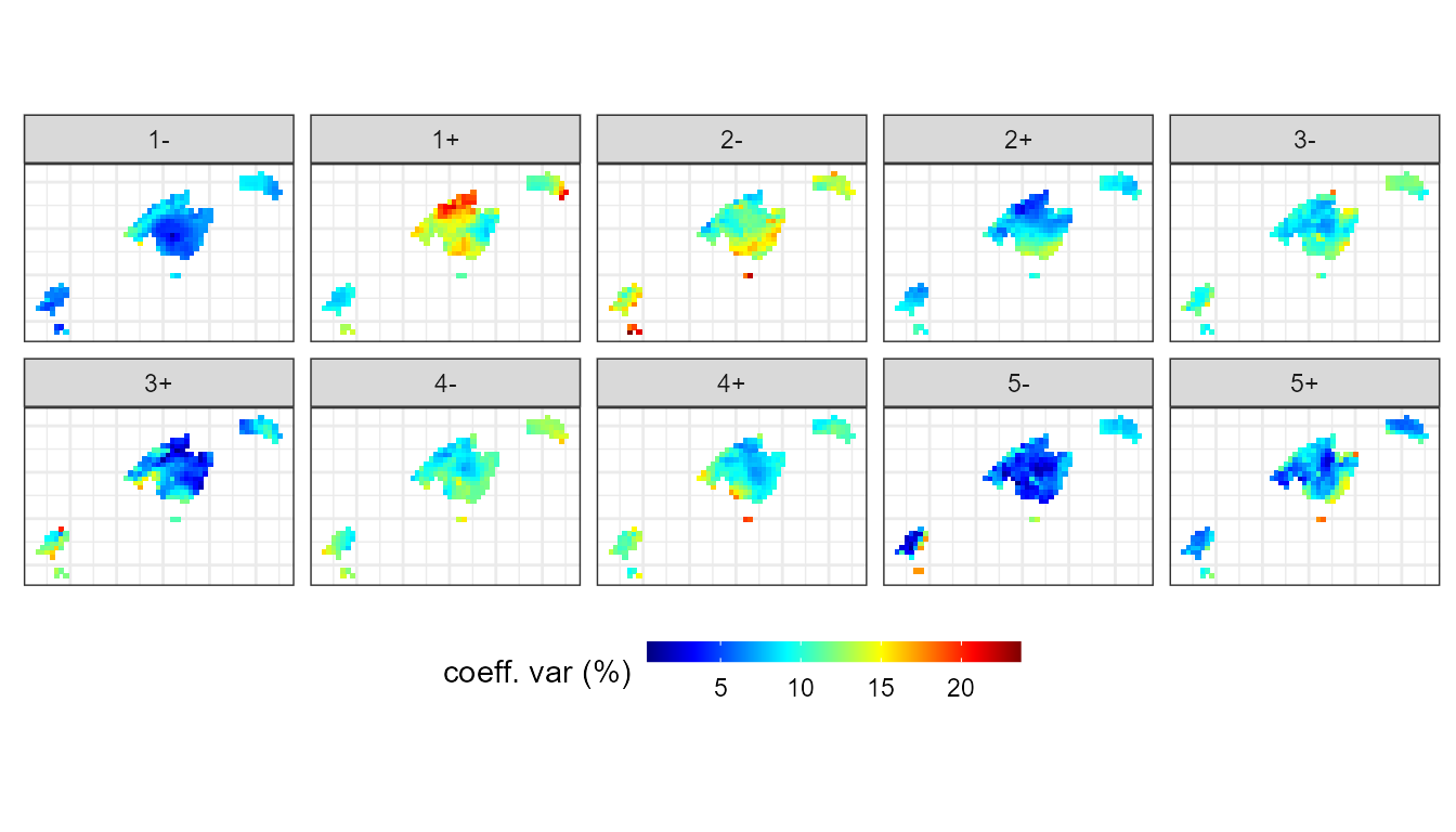 In addition, we can assess the spatial variability of this torrential events by creating the function of the coefficient of variation (cv) in the fun argument: